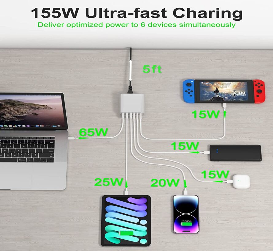 155W 6-Port Fast USB-C Charging Station Portable USB C Wall Charger